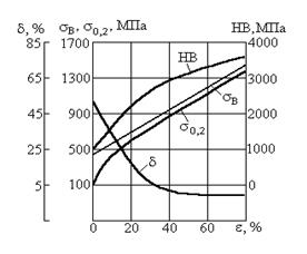 С увеличением степени холодной, происходящей при температуре ниже (0,15…0,2)Т0, деформации свойства, характеризующие сопротивление деформации (sв, s0,2, НВ и др.) повышаются, а способность к пластической деформации – пластичность (d и y) уменьшается (рисунок 1.22).