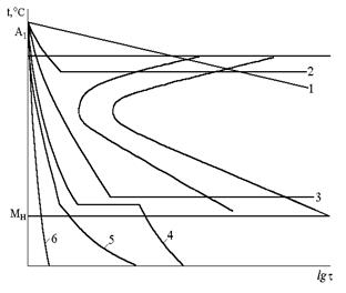 Рисунок 2.11. Сопоставление способов охлаждения при фазовой перекристаллизации и закалке стали: 1 – полный и неполный отжиг; 2 – изотермический отжиг; 3 – изотермическая закалка; 4 – ступенчатая закалка, 5 – закалка в двух средах; 6 – непрерывная закалка