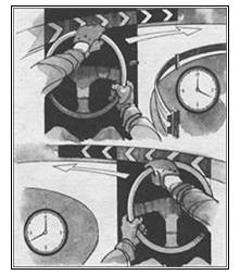 При движении по прямой готовность водителя к экстренному маневрированию обеспечивается симметричным расположением рук на рулевом колесе: “10 – 2” или “9 – З” (по аналогии с цифрами на циферблате часов). При необходимости маневра руки смещаются на боковой сектор рулевого колеса. Их положение при повороте налево—“8—12”, направо—“12—4”. Эти положения обеспечат готовность к действиям в критических ситуациях на дуге поворота, т. е. к экстренным маневрам – коррекции поворота (“до-вороту”), объезду препятствия – и стабилизации автомобиля при потере устойчивости и управляемости. Кроме того, положение рук на боковом секторе (боковой захват) позволяет противодействовать выравниванию автомобиля, вызванному самостабилизацией передней подвески, и центробежной силе, смещающей корпус водителя к наружной стороне. Боковой захват позволяет обеспечить несколько приемов управления, способы выполнения которых следующие: удержание автомобиля на дуге поворота — постоянная тяга вниз двумя руками из положения на боковом секторе. (Используется сила мышц-сгибателей, наиболее развитых у любого человека.) Коррекция траектории обеспечивается усилием и ослаблением тяги; “ доворот” — крутизну маневра на дуге поворота увеличивает рука, находящаяся сверху (в положении “12”). Другая рука, находящаяся в положении “4” или “8”, отпускает рулевое колесо и страхует его в боковой зоне, при необходимости подключаясь к “довороту” на больший угол; выравнивание траектории автомобиля – после завершения поворота повышение тяги двигателя способствует самостабилизации автомобиля – выравниванию управляемых колес. Руки на боковом секторе поочередно выполняют тормозящую функцию – сопровождающее руление, регулируя скорость самовыравнивания. Отпускать рулевое колесо нельзя, так как это может привести к резкому ритмическому заносу; стабилизация при заносе – при возникновении бокового скольжения задней оси, что чаще всего возникает на автомобиле с задними ведущими колесами (классическая компоновка), компенсировать занос можно быстрым поворотом рулевого колеса в сторону заноса на 90-180° без смены положения рук. Если амплитуда заноса большая, водитель переходит к поочередному рулению левой и правой руками со сменой положения рук на боковом секторе. При поворотах нежелательно перекрещивать руки в нижнем секторе рулевого колеса (так называемый перекрестный захват). Руление в нижнем секторе рулевого колеса почти всегда нежелательно. Любая критическая ситуация требует максимальных усилий, а исходное положение не позволяет приложить их.
