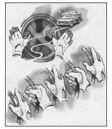 После крутого поворота автомобиль благодаря конструктивным особенностям передней подвески (кастору) самостабилизируется. Многие водители ослабляют захват рулевого колеса и позволяют ему “раскрутиться”. Этот неверный навык затем перерастает в прочную привычку и в конечном итоге приводит либо к ритмическому заносу, либо к невозможности в фазе выхода из поворота выполнить экстренный маневр.