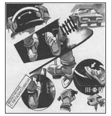 Самым эффективным способом экстренного замедления с максимальной скорости движения является ступенчатое комбинированное торможение. Оно включает импульсное торможение рабочим тормозом и последовательное переключение понижающих передач. Многие водители считают, что комбинированное торможение—это арифметическая сумма тормозных усилий рабочего тормоза и двигателя. Однако главным является не этот факт, а большая безопасность при замедлении. При торможении передние колеса загружаются, а задние разгружаются. Естественно, задние колеса первые подвержены блокированию и способствуют возникновению заноса. Другими словами, тормозное усилие лимитируют задние колеса, поэтому на многих автомобилях имеются специальные устройства, ослабляющие их действие, или спереди устанавливаются дисковые тормоза, а сзади – барабанные. Если в момент торможения на задние колеса подать крутящий момент от двигателя, то этим можно предотвратить блокирование колес (на автомобилях с классической компоновкой). Поэтому при торможении целесообразно включать понижающие передачи, так как это не усиливает, а ослабляет (!) тормозной эффект ведущих колес. Тем самым этот прием можно считать антиблокировочным, позволяющим стабилизировать автомобиль при интенсивном торможении. Нужно отметить, что и для переднеприводного автомобиля комбинированное торможение очень эффективно, так как позволяет сохранить управляемость передних колес и устойчивость автомобиля. Сложность приема комбинированного торможения связана с большим числом разнообразных действий. В управлении задействованы обе руки и обе ноги, притом каждая выполняет действия сложной координации с разными органами управления. При выполнении комбинированного торможения необходимо соблюдать определенную последовательность. 1. Принять позу готовности (положение рук на рулевом колесе “10—2” или “9—3”), перенести стопу правой ноги с педали подачи топлива на тормозную педаль, выбрать свободный ход педали. Приложить к тормозной педали серию тормозных импульсов, наращивая постепенно силу и продолжительность усилий до возникновения блокирования колес. Каждый цикл растормаживания использовать для коррекций устойчивости автомобиля с помощью резких коротких действий рулевым колесом. Продолжая торможение носком стопы, развернуть ногу пяткой кнаружи и нажать пяткой или боковой стороной стопы на педаль подачи топлива. Довести частоту вращения коленчатого вала двигателя до максимальной с помощью “перегазовки”. Выключить левой ногой сцепление и включить понижающую передачу быстрым движением правой руки с короткой паузой в фазе прохождения нейтральной передачи, например IV—О—пауза—III. Включить сцепление с короткой задержкой (пробуксовкой) в фазе включения. Далее продолжается структура действий 2 – 3 – 4с последовательным переключением понижающих передач вплоть до II, а в исключительных случаях и до I.