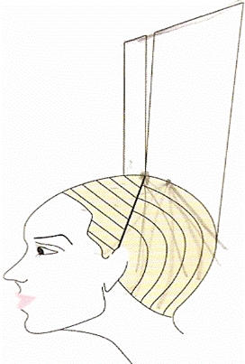 1. Розділити волосся на дві зони: потиличну та фронтальну. На потиличній зоні відділити контрольну прядку (вертикальним проділом), зістригти під кутом 90. Всі прядки потиличної зони підтягувати до контрольної. Прядки відділяються вертикальними проділами. Контрольна прядка нерухома. Кут зрізу прядки 125(подовження на потилицю) (рис.1).