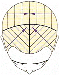 2.Орієнтуючись на контрольну прядку потиличної зони (90°), виділити прядку діагональними проділами. Стригти фронтальну зону підтягуючи волосся діагональними проділами до контрольної. Контрольна прядка нерухома (рис. 2).