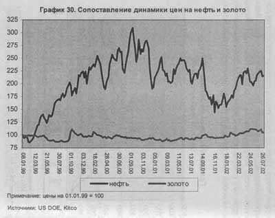 После того как в 1971 году США окончательно прекратили поддерживать золотое обеспечение доллара, разрушив тем самым Бреттон-Вудскую валютную систему, от былой стабильности цен на золото не осталось и следа. Тогда поняли, что в условиях инфляции деньги будут обесцениваться, а золото - дорожать. Однако цены на желтый металл достигли своего максимума - 850 долларов за тройскую унцию - в начале 1980-х годов на пике роста цен на нефть (график 29). Затем они начали снижаться вместе с другими товарными ценами. Естественно, возникли теории, объясняющие этот феномен, согласно которым золото утратило свою роль инвестиционного актива, превратившись в обычный биржевой товар. Правда, при этом в отличие от других товаров динамика цен на золото была менее хаотична: цена золота тесно коррелировала с интегральным индексом биржевых товарных цен. Таким образом, золото сохранило за собой часть функций универсального эквивалента.