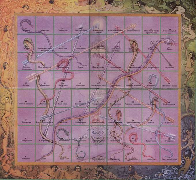 Изначальное название этой игры — Джняна-чаупада (джняна — знание, мудрость, чаупада —игра в кости; таким образом, название можно перевести как «Игра Знания»). Она была создана святыми провидцами прошлого как ключ к внутренним состояниям и для изучения принципов Дхармы, которую обычно называют «индуизмом». Семьдесят две клетки играль ной доски со всеми связывающими их стрелами и змеями, которые представляют семьдесят два основных плана бытия, открывают перед нами знания, заключенные в Ведах, Шрути, Смрити и Пуранах. Играть в эту игру — значит соприкасаться с божественной мудростью, которая содержится в учениях йоги, веданты и санкхьи, составляющих плоть и кровь инду истской традиции. В ходе игры вы автоматически передвигаетесь по полям игральной доски, каждое из которых имеет определенное название, отражающее одно из внутренних состояний, или планов бытия. Попадая на то или иное поле, игрок начинает обдумывать идеи и концепции, связанные с названием данного поля, до тех пор, пока снова не придет его очередь бросить кость, чтобы перейти к следующему состоянию. В результате через несколько минут в игру вовлекаются ум, интеллект и эго (чувство «я») игрока. Ни автор, ни время создания этой игры, которую мы сегодня называем Лилой, нам не известны. Впрочем, в индийской письменной традиции имя автора никогда не считалось чем-то существенным. Автор игры был лишь пером, ведомым Божественной Рукой, инструментом, выразившим Волю Творца, и его имя не было зафиксировано. Однако идеи и понятия, на которых строится игра, указывают на возраст по крайней мере 2000 лет. Вариант игры, использованный для настоящего издания, хранился в семье автора в индийс ком штате Уттар-Прадеш на протяжении примерно 150 лет. В распоряжении автора имеется и более древний вариант игры, купленный у антиквара в Раджастхане, однако он не сохранился полностью и поэтому не мог быть использован при составлении этого комментария. К игральной доске прилагалась книга, состоящая из стихов-шлок. После каждого бросания кости игрок читал стих, относящийся к тому месту, где он оказался. В шлоках описывались природа и значение пространств, представленных полями-квадратами игральной доски. К сожалению, эта книга была утеряна, почему и возникла необходимость написать новый ком ментарий, раскрывающий переплетение философских идей, связанных с названиями квадра тов, и разъясняющий метод использования игры для самопознания. В традиции, в которой возникла игра, смысл всех используемых санскритских терминов хорошо известен. Помимо этих определений, информации, полученной от некоторых санньясинов, игравших в эту игру в молодости или после вступления в орден, и терминов, указанных на самой игральной доске, некоторые знания восходят к семейной традиции автора. Все это, вместе взятое, и составило основу настоящего комментария. Создатели игры видели в ней прежде всего инструмент, развивающий понимание взаимо отношений индивидуального «я» с Абсолютным «Я». Прохождение через игру с сохранением этой позиции помогает игроку освободиться от иллюзии, крепко опутавшей его личность, и увидеть свою жизнь как отражение макрокосма. Число, выпавшее на игральной кости, опреде ляется не отождествлениями игрока, а взаимодействием космических сил, которые, в свою очередь, определяют развитие жизнен