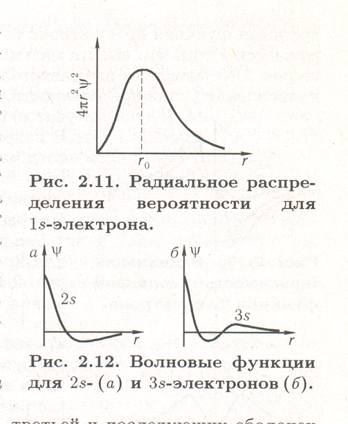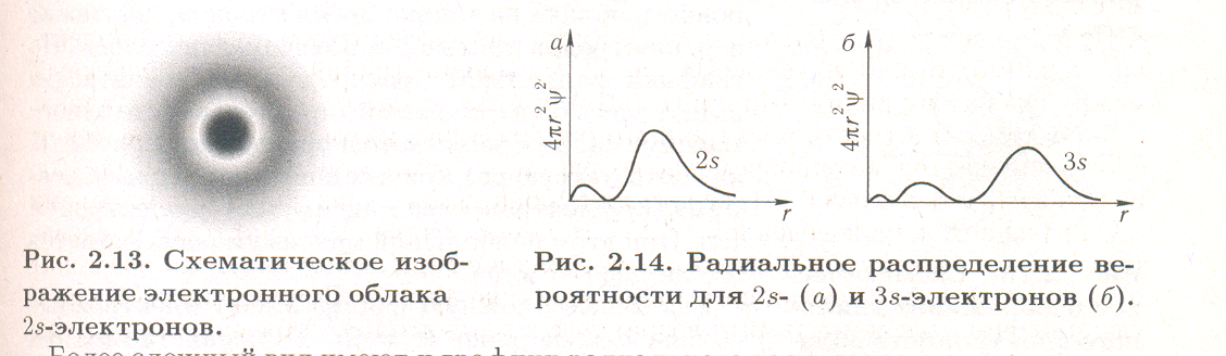 Как показывает рис.2.11, вероятность обнаружить 1s-электрон на малых расстояниях от ядра близка к нулю, так как r мало. Ничтожно мала и вероятность обнаружения электрона на очень большом расстоянии от ядра: здесь близок к нулю множитель Ѱ2 (см. рис. ранее ). На некотором расстоянии от ядра r0 вероятность обнаружения электрона имеет максимальное значение. Для атома водорода это расстояние равно 53 пм, что совпадает с вычисленным Бором значением радиуса ближайшей к ядру орбиты электрона. Однако трактовка этой величины в теории Бора и с точки зрения квантовой механики различна: согласно Бору, электрон в атоме водорода находится на расстоянии 53 nm от ядра, а с позиций квантовой механики этому расстоянию соответствует лишь максимальная вероятность обнаружения электрона. Электронные облака s-электронов второй, третьей и последующих оболочек обладают, как и в случае 1s-электронов, сферической симметрией, т. е. характеризуются шарообразной формой. Однако здесь волновая функция при увеличении расстояния от ядра меняется более сложным образом. Как показывает рис. 2.12, зависимость Ѱ от r для 2s- и Зs-электронов не является монотонной, на разных расстояниях от ядра волновая функция имеет различный знак, а на соответствующих кривых есть узловые точки (или узлы), в которых значение волновой функции равно нулю. В случае 2s-электрона имеется один узел, в случае 3s-электрона — 2 узла и т. д. В соответствии с этим, структура электронного облака здесь также сложнее, чем у 1s-электрона. На рис. 2.13 в качестве примера схематически изображено электронное облако 2s-электрона.