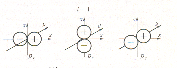 симметричностью функции. s-АО — симметричная функция, так как при любой из операций симметрии, переводящей точку r1 в точку r2, имеет место равенство: Ѱ(r1)=Ѱ(r2). На рис. 2.21 изображены АО р-симметрии. р-Орбитали характеризуются тремя различными значениями mi; в соответствии с этим они располагаются в пространстве тремя способами. При этом три р-электронных облака ориентированы во взаимно перпендикулярных направлениях, которые обычно принимают за направления координатных осей (x, у или z). Если АО ориентирована вдоль оси х, то она называется рx-орбиталью; соответственно определяются названия р y- и рz-орбиталей. Примечательно то, что при положительных значениях каждой из осей декартовой системы координат соответствующая р-АО положительна, а при отрицательных — отрицательна. Рассмотрим внимательнее отношение к операциям симметрии рx-АО.