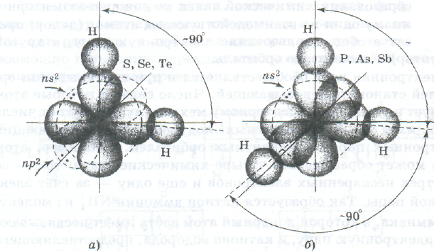 Схема перекрывания электронных облаков в молекулах соединений водорода с серой, селеном, теллуром (а), с фосфором, мышьяком и сурьмой (б): пунктирными линиями изображены орбитали пs и пр, на которых находятся несвязывающие электронные пары