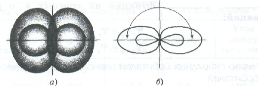 Взаимное расположение в пространстве двух sр-орбиталей одного атома: а — поверхности, охватывающие области пространства, где вероятность пребывания электрона составляет 90%; б — условное изображение