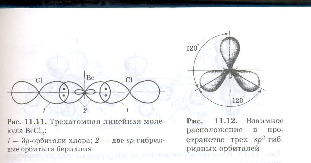 Графически линейную комбинацию s- и р-орбиталей можно изобразить схемой, приведенной на рис .(показать рисунок). Два образующихся гибридных sp-электронных облака имеют асимметричную форму, которая обеспечивает большее перекрывание с электронными облаками других атомов, чем перекрывание, возникающее с участием чистых негибридизированных s-и р-облаков. Тем самым гибридизация электронных облаков приводит к выигрышу энергии в результате образования более прочных химических связей. Этот выигрыш в энергии покрывает и затраты энергии на гибридизацию. Два гибридных sр-облака в результате взаимного отталкивания располагаются относительно ядра атома таким образом, что угол между ними составляет 180° (нарисовать рисунок). В результате такого расположения гибридных облаков молекулы состава АХ2, где А является центральным атомом, имеют линейную конфигурацию, т. е. ядра всех взаимодействующих атомов располагаются на одной прямой. Например, находятся в состоянии sр-гибридизации валентные электронные орбитали атома бериллия в линейной молекуле ВеСl2 (нарисовать рис.). Линейную конфигурацию вследствие sр-гибридизации валентных электронных орбиталей имеют также молекулы ВеВг2, Ве(СН3)2, ZnСl2, СО2 и ряд других.