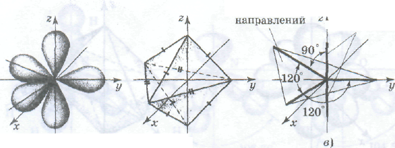 Если несвязывающая электронная пара в результате образования донорно-акцепторной связи превращается в связывающую, то силы отталкивания между этой новой связью и другими связями в молекуле становятся одинаковыми, выравниваются и углы между связями. Это происходит, например, при образовании катиона аммония из молекулы аммиака. Участие в гибридизации d-орбиталей. Если энергии орбиталей одного из d-подуровней атома не очень сильно отличаются от энергий s- и р-орбиталей, то d-орбитали также могут участвовать в гибридизации. Самым распространенным типом гибридизации с участием d-орбиталей является sр3d2-гибридизация, в результате которой образуются шесть равноценных по форме и энергии гибридных облаков (рис. а), направленных к вершинам октаэдра, в центре которого находится ядро атома. Октаэдр (рис. б) — правильный восьмигранник. Все ребра в нем равной длины, все грани — правильные треугольники. Реже встречается sp3d-гибридизация, в результате которой образуются пять гибридных облаков (рис. а), направленных к вершинам тригональной бипирамиды (рис. б). Тригональная бипирамида — это две равнобедренные пирамиды, соединенные общим основанием. Основание -- правильный треугольник. Полужирными штрихами на рис. б