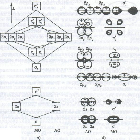 В молекуле водорода порядок связи ω равен единице: ω = Энергетическую диаграмму для молекулярных орбиталей, полученную при рассмотрении молекулы водорода, можно использовать и для анализа возможности существования других двухатомных молекул и ионов элементов первого периода. Так называемый молекулярный ион водорода H2+ состоит из двух протонов и одного электрона. Этот единственный электрон, переходя с атомной 1s-орбитали на связывающую молекулярную орбиталь, обеспечивает выигрыш энергии, достаточный для стабилизации иона H2+. В данном случае образуется частица, в которой связь обусловлена не электронной парой, а единственным электроном. С помощью метода валентных связей существование такого соединения объяснить нельзя. В ионе He2+ имеется три электрона. Два из них занимают связывающую орбиталь, а третий находится на разрыхляющей орбитали. На связывающей орбитали электронов больше, чем на разрыхляющей, поэтому ион может существовать. Двухатомные гомоядерные молекулы. Молекулярные орбитали, возникающие из атомных орбиталей 2s и 2р, образуют следующую «энергетическую лестницу» (рис. а): σ2s < σ*2s < σ2рх < π2ру = π2рz < π*2рy = π*2рz < σ*2рх. Атомные орбитали 1s не участвуют в образовании молекулярных. В приведенной «энергетической лестнице» энергии σ2р-и π2р-орбиталей близки, и их взаимное расположение зависит от заселенности предыдущих орбиталей. Поэтому в молекулах В2, С2, N2 орбиталь σ2рx лежит выше орбиталей π2ру и π2рz. Определим кратности связей и числа неспаренных электронов в гомоядерных, т. е. состоящих из одинаковых атомов, молекулах элементов второго периода. При этом запись молекулярных орбиталей упростим, опустив символы атомных орбиталей, из которых они образуются. Образование молекулы Li2 из двух атомов Li означает заполнение связывающей оорбитали двумя электронами: 2Li[2s1] →Li2[(σ)2] Молекула Li2 имеет таким образом одинарную σ-связь. Рис. Энергетическая диаграмма расположения атомных АО и молекулярных МО орбиталей (а) и схема образования молекулярных орбиталей (б) из атомных орбиталей Молекула Ве2 может образовываться только путем заполнения орбиталей σ и σ* двумя электронными парами: 2Ве[2s2] → Ве2[(σ)2(σ*)2], но при таком заполнении числа электронов на связывающей и разрыхляющей орбиталях равны, энергия системы не уменьшается, и молекула Ве2 не образуется, что подтверждено экспериментально. В образовании молекулы В2 участвуют шесть электронов двух атомов бора: 2B[2s22p1] → B2[(σ)2(σ*)2(πy)(πz)] В молекуле В2, согласно правилу Хунда, два электрона попадают по одному на две энергетически равноценные связывающие орбитали: πy и πz. Порядок связи в молекуле В2 равен единице. Наличие двух неспаренных электронов с параллельными спинами придает ей парамагнитные свойства*. Это свойство, предсказываемое методом молекулярных орбиталей, обнаружено экспериментально. Продолжая заполнение молекулярных орбиталей электронами, нетрудно определить электронные формулы, кратности связей и магнитные характеристики других гомоядерных молекул: С2[(σ)2(σ *)2(πy)2(πz)2], ω=2; диамагнитная молекула; N2[(σ)2(σ*)2(πy)2 (πz)2(σx)2], ω = 3; диамагнитная молекула; O2 [(σ)2(σ*)2 (σх)2(πy)2 (πz)2(π*y) (π*z)], ω = 2; два неспаренных элекрона, парамагнитная молекула; F2 [(σ)2(σ*)2 (σх)2(πy)2 (πz)2(π*y) 2 (π*z) 2], ω = 1; диамагнитная молекула; Ne2 [(σ)2(σ*)2 (σх)2(πy)2 (πz)2(π*y) 2 (π*z) 2(σx)2] — связь отсутствует.