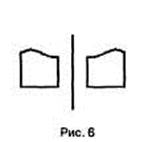 Различие ассоциаций между понятиями «лево» и "право" вплотную связано с функциональной асимметрией двух полушарий головного мозга. Причем эта зависимость обнаружена благодаря догадке врача П.Брока совсем недавно — чуть более 150 лет тому назад. Но и сегодня основная причина преобладания правой руки над левой нам практичес- ки неизвестна. Поэтому здесь мы будем говорить не столько о причине горизонтальной асимметрии, сколько о ее следствии. Намек на асимметричность как на художественно-выразительное средство сделал еще ФЛанг (1727 г.): «Правой рукой в сценическом действии должно пользоваться главным образом. Делать жесты следует преимущественно правой рукой. Я говорю это не в том смысле, что левая должна быть все время неподвижна, но что для пластического выражения того, что требует существо речи, она должна только помогать правой руке, однако, порою левая должна оставаться в полном покое и действовать должна одна только правая рука» [29]. Тем не менее, то, что система «право-лево» еще относительно недавно в необходимой полноте обратила на себя внимание в искусстве, иллюстрирует следующее высказывание Е.П.Валукина: «Необходимо соразмерно и точно, в едином темпе с движениями всего тела владеть своими руками. Важное значение в этом смысле имеют новые определения "ведущей" и "ведомой" руки. В работах многих авторов, посвященных методике преподавания классического танца, не было определения "ведущей" и "ведомой" руки. Однако сама практика педагогической и репетиционной работы, которая требует бережного сохранения классического наследия и сравнимая с работой реставратора, потребовала введения этих понятий. Научный анализ движений классического танца позволил точно определить закономерности построения поз, переводарук из позиции в позицию относительно "ведущей" или "ведомой" руки» [5]_- Разумеется, асимметричность, ассоциативно связанная у нас с различием «ведущей» (чаще всего правой) руки и «ведомой» (обычно левой), проявляет себя не только в этом. Рассмотрим ее психологические аспекты подробнее. Очевидно, что симметричность двух объектов можно рассматривать относительно оси симметрии, расположенной в любом направлении. Но в повседневности мы чаще пользуемся осью, по которой расположено наше тело, и рассматриваем предметы в их естественном положении, т.е. так, как мы их привыкли видеть. Рассмотреть симметрию по сагиттали, где осью являешься ты сам, невозможно. Остаются две основные координаты, относительно которых возможно рассмотрение симметричности объектов. Это вертикаль и горизонталь. Очевидно, что из всех вариантов расположения симметрии (рис. 5 и 6), естественней выглядит горизонтальная. Попробуем разобраться, почему это так. Наиболее актуальными для человека в подавляющем количестве случаев (на заре цивилизации и сейчас) остаются именно горизонтальные симметрии и асимметрии. Тело человека практически симметрично, когда расположено лицом или спиной по отношению к другому человеку. Таким образом, симметрия человека, повернутого в фас, стала как бы знаком встречи, прихода, а симметрия со спины — прощания, ухода. И наоборот, асимметрия фигуры, расположенной в профиль, знак «мимо» — ни встреча, ни разлука. Оставаясь многие тысячелетия «мерилом всех вещей», человек в отношении естественного и рукотворного миров, созерцая и