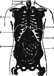Рис. 1. Расположение внутренних органов. 1 - гортань; 2 - трахея; 3 - правое легкое; 4 - сердце; 5 - желудок; 6 - печень; 7 - тонкая кишка; 8 - толстая кишка.