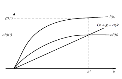 Модель экономического роста Солоу является необходимой отправной точкой практически всех исследований экономического роста. С ее помощью выявляются причины временного и постоянного устойчивого роста экономики и существование межстрановых различий в уровне жизни населения. В модели рассматриваются четыре переменные: выпуск Y, капитал К, труд L и эффективность труда одного работника Е, зависящая от состояния его здоровья, образования и квалификации. Переменная Е отражает уровень «знаний», накопленных в обществе, или трудосберегающий тип научно-технического прогресса, под влиянием которого повышается эффективность труда одного работника[5]. Выпуск Y может изменяться во времени только при изменении во времени факторов производства: К, L, Е. Изменение численности работников и эффективности труда Е всегда рассматриваются совместно: в каждый момент времени в экономике насчитывается L работников с возросшей эффективностью труда или возросшее число работников с постоянной (начальной) эффективностью труда (LЕ). Таким образом, выпуск описывается производственной функцией Y=F(K,LE). Относительно производственной функции кроме обычных свойств предполагается: 1) несущественность влияния других факторов производства, в частности земли и природных ресурсов; 2) постоянная отдача от масштаба. Экономически такая предпосылка соответствует достаточно большой экономике, для которой выигрыш от специализации себя исчерпал, и поэтому новые факторы производства используются тем же технологическим способом, что и уже существующие. Последнее предположение позволяет перейти к производственной функции в интенсивной форме – в расчете на единицу труда с постоянной эффективностью – Таким образом, выпуск в расчете на единицу труда с постоянной эффективностью зависит только от уровня капиталовооруженности и не зависит от масштаба экономики. В модели предполагается, что выпуск в экономике расходуется на потребление и инвестиции, государство отсутствует, экономика закрытая, так что основное тождество национальных счетов имеет вид Считается, что все, что сберегается, инвестируется, т.е. инвестиции равны сбережениям. Одна единица инвестиций превращается без дополнительных издержек в одну единицу нового капитала. Лаг отсутствует. Сбережения пропорциональны доходу. Норма сбережения s задается экзогенно и постоянна во времени (0 < s < 1). Таким образом, Понятия «население» и «рабочая сила» совпадают. Существующий капитал изнашивается с нормой В расчете на единицу труда с постоянной эффективностью уровень капиталовооруженности изменится на величину