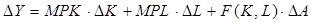 где Используя статистические данные, можно подсчитать вклад труда и капитала в экономический рост. Оценка же вклада научно-технического прогресса в экономический рост не может быть проведена непосредственно и обычно вычисляется как остаточный член уравнения (3) (так называемый остаток Солоу):