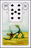 В древних изображениях, особенно относящихся к раннему христианству, якорь обнаруживает близкое родство с символами креста и трезубца. В нем намек на прочное закрепление новых религиозных общин, на их стойкую веру в хаосе языческого окружения. Верхнюю часть можно рассматривать как изображение человека, стоящего вертикально и вытянувшего руки вверх, то есть к небу. Часть окружности (дуга внизу) — знак материального мира, Земля, которая вновь и вновь порождает человека. Старинный символ надежды, особенно в сфере человеческих отношений. Ваша мечта осуществится, говорит эта карта, ибо Ваши отношения с другими строятся на прочной основе верности и дружбы. Эта карта является символом доверия и постоянства. Вы хотите найти спокойную пристань. Безопасность Вы найдете в кругу семьи или в общении с близким человеком. Если эта карта рядом с ДОМОМ, вероятно изменение места жительства. Вы достигнете своей цели. Данная карта будет неизменно благоприятной вне зависимости от окружения. Это также верно для профессиональных и деловых вопросов. Вас ждет успех. Посмотрите на соседние карты. Находясь вдали от карты спрашивающего или в неблагоприятном окружении, она говорит о неустойчивости и непостоянстве убеждений. Вас должно насторожить только соседство с картой КРЫСЫ. Карты предостерегают Вас от излишнего упорства. Упрямство и тупое следование правилам могут все испортить. В вопросах взаимоотношений. Верность, доверие. Отношения стабильны, ничто не может разрушить ваш союз. Рядом с неблагоприятными картами - скука, пресыщение. В деловых вопросах. Крепкое хозяйство, прочные основы, хорошая материальная база. В медицинских вопросах. Стабильное состояние без каких-либо изменений. Имеющиеся заболевания могут принять вялотекущую хроническую форму. Значение в парном сочетании* c другими картами + Карта 1 ВСАДНИК КРЕСТ