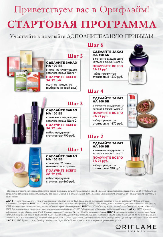 Ваш успешный бизнес-старт в 3 шага: 1. Суммарный заказ на 100 ББ (примерно 4000 руб. по ценам каталога) на первом Шаге должен быть размещен в течение 21 дня с момента регистрации в Орифлэйм. 2. Второй суммарный заказ на 100 ББ необходимо разместить в течение каталога, следующего после выполнения Шага 1. 3. Третий суммарный заказ на 100 ББ необходимо разместить в течение каталога, следующего после выполнения Шага 2. Программа Лояльности 2014. Новый план успеха