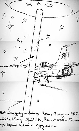 «В 1956 году, совершая стратегическую ледовую разведку на самолете «Ту-104», мы неожиданно увидели, что с левого борта параллельно нашему курсу движется какой-то непонятный летательный аппарат, по форме напоминающий большую чечевицу жемчужного цвета с волнообразно пульсирующими краями. Через 15–18 минут неизвестный аппарат резко изменил курс, обогнал нас и молниеносно ушел вверх, исчезнув в синеве неба. Скорость его ухода была настолько велика, что это явление казалось нам каким-то сверхъестественным…» Министр гражданской авиации ничего не ответил на это пылкое послание знаменитому флаг-штурману. Однако доподлинно известно, что занимался своей работой после этого Валентин Аккуратов недолго. А вот еще одна история, рассказанная летчиком-истребителем, подполковником ВВС Львом Михайловичем Вяткиным: «…7 августа 1967 года на аэродроме Белбек в 6:30 утра, когда я заступал на боевое дежурство по охране госграницы, мой механик тронул меня за плечо: «Командир, командир, посмотри, какая бандура летит». Я повернулся, солнце еще не взошло, горизонт, голубые горы Крымские и Ай-Петри. И на фоне Ай-Петри движется очень медленно НЛО желто-белого цвета…».