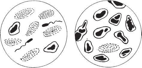 Выявление признаков обострения заболевания на ранних стадиях может представлять определенные трудности. Последнее обусловлено тем, что аналогичные жалобы предъявляют пациенты с простатодинией, застойной простатой, варикозным аноректальным симптомокомплексом и пояснично-крестцовым радикулитом. При обострении хронического простатита вначале обычно возникает зуд, жжение или тупые ноющие боли в пределах мочеиспускательного канала, промежности и заднего прохода. Нередко боли иррадиируют в мошонку. Иногда появляются неприятные ощущения в яичках. Некоторые больные отмечают «миграцию» болей из одного органа в другой. Распространение болевых ощущений наблюдается в подвздошную область. Не менее важным представляется и то обстоятельство, что в 30–50 % случаев хронического простатита при ректальном пальцевом исследовании не выявляются изменения консистенции, формы и размеров железы. Существенное значение имеют и особенности современного течения простатита, в том числе и гонорейной этиологии. Нередко отмечаются малосимптомность и преобладание стертых катаральных форм. Имеются наблюдения, что трихомонадное поражение простаты констатируется более чем у 50 % лиц, которые считают себя здоровыми. Бессимптомное течение трихомонадного простатита может продолжаться годами. При этом возбудитель сохраняет свою патогенность и обусловливает инфицирование партнерши при половом акте. В результате асимптомного течения простатита периодически могут возникать воспаления уретры, которые кажутся необъяснимыми и неожиданными. В связи с нередкой скудостью клинических проявлений принципиально важным является не только пальпаторное или инструментальное исследование предстательной железы, но и микроскопия ее секрета с целью выявления лейкоцитоза и идентификации возбудителей инфекций, передающихся половым путем. При подозрении на воспаление простаты исследование ее секрета является основным диагностическим критерием и должно быть многократным. В случае начинающегося обострения простатита при цитологическом анализе в мазках секрета определяются повышение содержания лейкоцитов (более 10 клеток в поле зрения), клеток плоского и переходного эпителия, нередко выраженный анизоцитоз, вакуолизация цитоплазмы, ферментация и распад ядер, уменьшение ШИК-положительных веществ. В норме секрет простаты имеет лейкоцитарную формулу, сходную с формулой крови здорового человека, за исключением постоянно отсутствующих эозинофилов. При простатите лейкоцитарная формула характеризуется нейтрофилезом (главным образом за счет сегментированных форм), лимфопенией и наличием эозинофилов. Параллельно с увеличением количества лейкоцитов содержание лецитиновых зерен уменьшается, нередко они исчезают совсем (рис. 3). В случаях очагового характера патоморфологических изменений первое исследование может не показать изменений в секрете простаты, так как вначале выделяется секрет из непораженных долек железы. В этой связи более надежными являются повторные анализы.