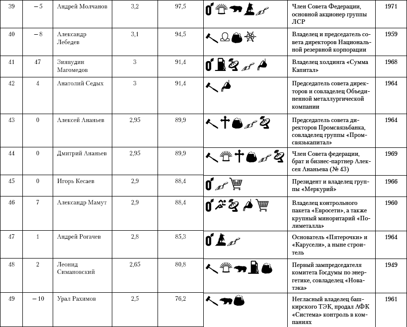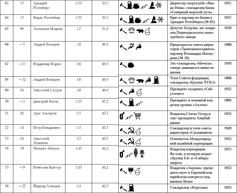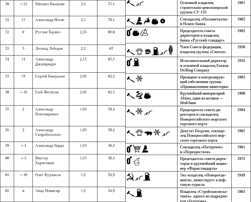 За период прошедшего кризиса крупные банки и корпорации изрядно укрепили свои позиции – они стали еще более богатыми. Особенно успешным для них оказался 2010 г. Премьер Владимир Путин сделал превосходный доклад 20 апреля 2011 г. перед депутатами Государственной думы. Кажется, говорил искренне о необходимости заботы о человеке труда, упрекнул СМИ и TВ, что они слабо отражают самоотверженную работу простого труженика, «на горбу» которого все и держится. «Поэтому, – заверил премьер, – мы и дальше будем улучшать положение рядовых граждан». Все бы хорошо, но он, разумеется, не стал затрагивать такую «необъяснимую» проблему: почему минимальный размер оплаты труда 5,6 тыс. руб. и ее получают миллионы тружеников, а 500 человек контролируют активы (каждый) от 28,3 млрд долл. до 160 млн долл.; из них 114 миллиардеров (от 28,3 до 1 млрд долл.). И все эти «500» фамилий контролируют 85% активов всей экономики страны. Так какие шансы у правительства Путина «заботиться» о человеке труда, если львиная доля богатства находится вне правительственного контроля? Через налоги? И сколько они вносят? – мизер! По сути, от них зависит процветание страны и благополучие общества, им вверил премьер Путин судьбу соотечественников, подавляющая часть которых, как показало испытание прошедшим кризисом, не выдержали этого испытания – они продолжали мошенничать и в трудные времена. Это им премьер оказал «помощь» в размере 200–250 млрд долл., в то время как на оказание помощи десяткам миллионов простых граждан было направлено в 2–3 раза меньше. Для оказания помощи малому и среднему предпринимательству, например, было направлено всего 5 млрд долл.; уменьшились затраты на финансирование академической науки (правда, они несколько возросли в университетах). В результате социальные разрывы в обществе все более возрастают, перебивая все негативные рекорды из самых неблагополучных стран; «среднего класса» вообще нет – его слабые ростки приостановились в результате того, что плодами рентного дохода пользуются супербогатые банкиры и предприниматели и правящая бюрократия. Ниже приведена таблица рейтинга российских миллиардеров, составленная журналом «Финанс» на 2011 г.