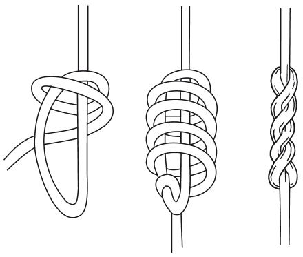 Этот узел инки использовали в своей узелковой письменности. Сделайте на нити слева простую петлю, затем закрепите место соединения пальцами и натяните нить. Другой рукой сделайте несколько витков свободным концом вокруг натянутой нити. После чего вденьте конец внутрь петелек с левой стороны от натянутой петли и в саму петлю. Затяните все петли (рис. 47).