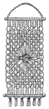 На следующем этапе работы продолжите плести полотно квадратными узлами в шахматном порядке. Свяжите 5 рядов. После чего перераспределите нити в шахматном порядке и свяжите на каждой группе нитей цепочку из квадратных узлов. Завяжите все нити горизонтальными репсовыми узлами на второй палочке. Концы нитей соберите в несколько пучков и на каждом пучке выполните оплетку. Ножницами подровняйте все концы нитей. Петелька для подвешивания панно. Отрежьте две нити длиной по 1 м, сложите их пополам и закрепите на одном конце верхней палочки. Из четырех концов нити сплетите витую цепочку из одинарных плоских узлов. Второй конец цепочки закрепите на другой стороне палочки с изнаночной стороны (рис. 94).