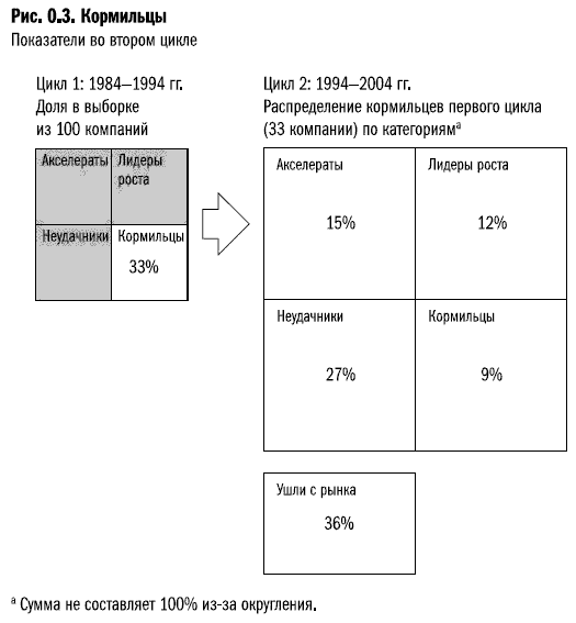 В первом экономическом цикле компании‑кормильцы обеспечили своим акционерам такой же уровень доходов, как лидеры роста, хотя по темпам роста выручки они отставали от экономики в целом. Однако во втором цикле удача отвернулась от них (см. рис. 0.3). Лишь 9 % компаний из 33 – Southern Company Consolidated Edison и ITT – смогли сохранить вплоть до 2004 г. высокие доходы для акционеров при низких темпах роста выручки.