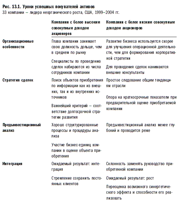 Вторая платформа реализации масштаба, которую мы хотим рассмотреть в этой главе, – это механизм осуществления слияний и поглощений. В крупной компании на сделки слияния и поглощения в среднем приходится более 3 процентных пунктов среднегодовых темпов роста (у лидеров роста – 6,9 процентных пунктов). Поэтому очевидно, что корпорация должна обладать достаточными ресурсами и навыками для заключения таких сделок, а также иметь гарантии, что приобретение принесет желаемые плоды. С помощью слияний и поглощений компании могут получить структурные преимущества на различных рынках. Ранее мы показали, что слияния и поглощения вносят более существенный вклад в повышение стоимости компании, чем принято считать. Но этот рост нельзя гарантировать. Вот почему механизм, позволяющий заключать больше качественных сделок слияния и поглощения, обеспечит компанию реальным преимуществом масштаба. Чтобы понять, от чего зависит эффективность слияний и поглощений, мы проанализировали работу нескольких крупных американских компаний, наиболее активных в этой сфере за последние десять лет[97]. Мы побеседовали с двадцатью топ‑менеджерами и выяснили, чем поведение компаний с совокупными доходами акционеров выше среднего уровня отличается от поведения компаний с более низкими совокупными доходами акционеров (рис. 13.1)[98].