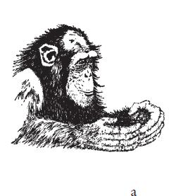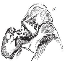 Рис. 1.5. Знаки гориллы Коко (а – “Коко”, б – “птичка”). Антропоиды могут целенаправленно просить экспериментатора о языковом обучении. Орангутаны Галины Григорьевны Филипповой, когда забывали жест, протягивали ей руку, чтобы она сложила им пальцы в правильную комбинацию 18. Шимпанзе Лана, несколько раз безуспешно попытавшись попросить незнакомый объект (коробку, в которую были положены конфеты M&M’s), в конце концов обратилась к тренеру (Тиму Гиллу) с просьбой сообщить ей название этого предмета 19 (на языке лексиграмм это выглядело так:? TIM GIVE LANA NAME‑OF THIS “Тим назовет Лане это?”, букв. “Тим даст Лане <как> это называется?”). Выяснилось, что “и шимпанзе, и бонобо могут спонтанно, без направленного интенсивного обучения осваивать язык‑посредник благодаря пребыванию в языковой среде, как это делают дети. Однако они следуют медленнее по этому пути и, разумеется, могут продвинуться не так далеко, как дети” 20. Обезьяны, обученные “амслену”, демонстрируют способность к овладению “двойным членением”, поскольку они могут составлять новые знаковые единицы из элементарных знаков, членящихся на незначимые хиремы. Возможность передачи языковых навыков потомству также оказалась не уникальной для человека 21. Шимпанзе Уошо обучила своего приемного сына Лулиса знакам амслена (люди не показывали знаков не только ему лично, но и в его присутствии, но он перенял 55 знаков от Уошо и других обезьян), и в результате они смогли общаться на этом языке‑посреднике между собой. Видеозаписи, сделанные в отсутствие экспериментаторов, показывают, что шимпанзе – члены “семьи Уошо” могут вести между собой активные диалоги, обсуждают содержание глянцевых журналов (ногами держат журнал, а руками при этом жестикулируют), помнят порядок праздников, когда для них устраивается угощение. Опыты с шимпанзе Элли и, позднее, с бонобо Канзи, Панбанишей и др. показали, что антропоиды могут соотносить – без участия соответствующих предметов – знаки устной речи (английские слова) со знаками жестового языка или лексиграммами. Они достаточно хорошо различают звучащие слова и прекрасно понимают, что различные сочетания одних и тех же фонем могут иметь разное значение. А недавно выяснилось, что обезьяны в принципе способны даже овладеть письмом: однажды Панбаниша (одна из сестер Канзи), в одиночестве тоскуя у окна и желая отправиться на прогулку, в конце концов взяла в руки мел и нарисовала на полу соответствующие лексиграммы (на снимке, сделанном скрытой камерой, наиболее узнаваем уголок – символ, обозначающий хижину в лесу). Никакой дрессировкой достичь подобных результатов невозможно. Обезьяны не действуют по затверженным программам – они применяют выученные ими языки‑посредники вполне творчески. Употребление ими “слов” языка‑посредника выдерживает проверку двойным слепым контролем. В одном из экспериментов шимпанзе Шерман и Остин должны были набрать лексиграмму на клавиатуре компьютера, затем пойти в другую комнату и выбрать соответствующий предмет. При этом один из экспериментаторов записывал набранную лексиграмму, не видя предмета, а другой, не видевший лексиграммы, записывал, какой предмет был выбран (таким образом исключалась возможность любой, даже неосознанной, подсказки со стороны человека). Этот опыт показал, что обезьяны употребляют знаки язык