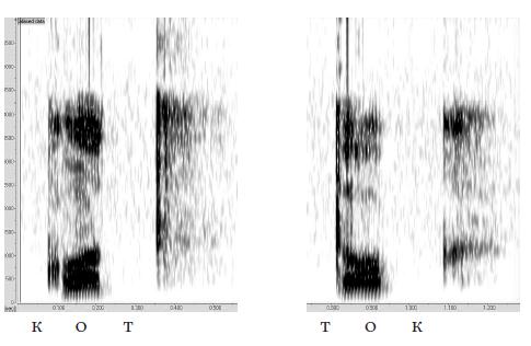 Рис. 1.9. Сонограммы слов кот и ток (поскольку слова были произнесены отдельно, на конце слышен – и виден на сонограмме – вокалический призвук). Если взять, например, слово кот, разделить его на части, соответствующие к, о и т и переставить их в обратном порядке, мы не услышим слова ток, поскольку переходы от звука к звуку окажутся неправильными: например, при переходе к гласному о надо уже с самого начала произнесения согласного вытягивать губы в трубочку, и это имеет вполне определенный акустический эффект 57. Формантные переходы между соседствующими звуками нередко позволяют нам “услышать” нужный звук даже в том случае, когда он не был реально произнесен, – и мы вполне можем не осознать, что вместо, скажем, Он – человек ответственный услышали… чек ответственный. В ходе исторического развития языка такой эффект восприятия дает почву для выпадения звуков, ср., например, франц. vie “жизнь” < лат. vīta (t между гласными сначала озвончилось в d, затем несколько ослабилось, и в конце концов, к XI в. выпало совсем 58). Существует несколько теорий для объяснения того, как люди распознают речевые звуки. Согласно одной, акустическое представление связано с представлением артикуляторным: для распознаваемого звука подбирается комбинация артикуляторных движений, которая могла бы его произвести, причем эти комбинации у разных людей могут различаться 59. Так же, через подбор артикуляторных движений, осуществляется нередко распознавание зрительных образов слов: это отчетливо видно на примере людей малограмотных или читающих на плохо знакомом языке – во время чтения они заметно шевелят губами (а иногда даже тихонько проговаривают каждое слово). Но даже у грамотных людей при чтении про себя отмечается усиление биотоков в мышцах, связанных с произнесением речевых звуков 60 {6}. Как показали исследования основателя отечественной нейропсихологии Александра Романовича Лурии (в дальнейшем его результаты были подтверждены и дополнены), чем сложнее воспринимаемый текст, тем сильнее нарушается его понимание при искусственном затруднении артикуляции 61. Согласно другой теории, в мозгу существуют акустические образы звуков речи – как должно выглядеть “прототипическое” а, как – б и т. д. Таких прототипов может быть более одного, поскольку в разном окружении звуки реализуются по‑разному. Третья теория предполагает, что главную роль при распознавании речевых звуков играют имеющиеся в мозгу особые нейронные распознающие устройства – детекторы, – настроенные на отдельные смыслоразличительные признаки фонем. Поскольку каждая фонема обладает уникальным набором таких признаков, комбинация показаний детекторов определяет фонему однозначно. Вероятно, все эти теории в определенной мере справедливы и дополняют друг друга. Анализатор речевых звуков работает у человека чрезвычайно быстро (быстрее, чем распознаются неречевые звуки) – до 20–30, а при искусственном ускорении речи – до 40–50 фонем в секунду 62, поэтому вероятно, что минимальной единицей восприятия является не отдельная фонема, а слог целиком. Длительность типичного слога – примерно 250 миллисекунд – это как раз тот объем акустической информации, который человек может удерживать в так называемой “эхоической памяти” (т. е. помнить сразу после предъявления, пока еще не начался процесс распознава