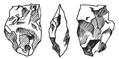Рис. 3.4. Вот такими камнями, возможно, пользовались предки “хоббитов”, жившие на о. Флорес около 800 тыс. лет назад 30. больше и лоб был менее покатым. Затылок был не вытянутым назад, как у неандертальца (“неандертальский шиньон”), а более округлым, как у сапиенса. Более изогнутым было основание черепа – если связывать это с положением гортани (см. ниже), то получается, что к членораздельной звучащей речи гейдельбержцы были ближе, чем неандертальцы. В то же время у гейдельбержцев отмечаются и архаичные признаки – кости свода черепа очень толстые, толще, чем у неоантропа, а заглазничная область сильно сужена 31. Многие образцы, относимые ныне к этому виду, ранее рассматривались либо как прогрессивные эректусы, либо как ранние неандертальцы. Переходным звеном от архантропов к гейдельбержцу является, вероятно, группа гоминид, представленная экземпляром OH9 (иногда называемым “шелльским человеком”, или Homo leakey), который был найден в слое II в Олдувайском ущелье 32 и датируется временем 0,9–1 млн. лет назад 33. Близки к Homo heidelbergensis останки, обнаруженные в пещере Гран Долина (район Атапуэрка) в Пиренеях и датируемые временем порядка 800 тыс. лет назад. Испанские исследователи Хуан Луис Арсуага, Антонио Росас и Хосе Бермудес‑де‑Кастро (авторы находки) полагают 34, что это отдельный вид (названный ими Homo antecessor), являющийся непосредственным предком человека разумного. Гейдельбергский человек, по их мнению, также является потомком, Homo antecessor.