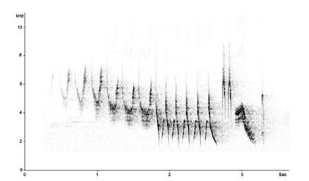 Рис. 4.2. Сонограмма песни зяблика (Fringilla coelebs). У певчих птиц, а также у попугаев и колибри, которые тоже обучаются своим звуковым коммуникативным сигналам посредством звукового подражания, контроль за звукопроизводством осуществляется не теми мозговыми структурами, что у тех видов, у которых звуковые сигналы являются врожденными 18. Повреждения аналогичных участков мозга приводят к аналогичным нарушениям звукопроизводства: при одних птицы, подобно людям с афазией Брока, теряют способность правильно составлять последовательности звуков, при других – способность выучивать новые звучания, при третьих – сохраняют лишь способность к эхолалическому повторению 19. Множество аналогичных черт у языка и с коммуникацией китообразных. В обоих случаях носителем информации является звук (правда, у китообразных, в отличие от человека, большая часть сигналов передается в ультразвуковом диапазоне). У дельфинов есть “имена собственные” – знаменитый “свист‑подпись”: этим сигналом (индивидуальным для каждой особи) дельфины завершают свои сообщения, и с его помощью их можно позвать. У касаток Orcinus orca были обнаружены локальные диалекты 20. Как и в языках людей, одни “слова” (звуковые сигналы) у касаток более стабильны, другие сравнительно быстро (у касаток – на протяжении порядка 10 лет) меняются 21. Звуковые сигналы дельфинов‑афалин (Tursiops truncatus), согласно наблюдениям В.И. Маркова 22, комбинируются в комплексы нескольких уровней сложности. Комплекс, состоящий из нескольких звуков, сгруппированных определенным образом, может входить составной частью в комплекс более высокого уровня подобно тому, как слово, состоящее из нескольких фонем, входит составной частью в более сложный комплекс – предложение. Так же, как фонема может быть описана как совокупность смыслоразличительных признаков, в звуковых сигналах дельфинов могут быть выделены отдельные компоненты, противопоставляющие один звук другому. Скорее всего, столь сложное устройство сигналов говорит о том, что у дельфинов (как и у людей) есть возможность (а значит, вероятно, и необходимость) кодировать большое (по подсчетам Маркова, потенциально даже бесконечно большое) количество разнообразной информации. По‑видимому, коммуникативная система дельфинов позволяет им передавать в том числе и весьма конкретные сведения. В эксперименте, проведенном Уильямом Эвансом и Джарвисом Бастианом 23, два дельфина (самец Базз и самка Дорис) были обучены нажимать на педали в определенном порядке, чтобы получать пищевое подкрепление. Порядок менялся в зависимости от того, ровно горела лампочка над бассейном или же мигала, а подкрепление выдавалось лишь в том случае, когда на педали в правильном порядке нажимали оба дельфина. Когда лампочку установили так, чтобы ее могла видеть только Дорис, она оказалась в состоянии “объяснить” Баззу через непрозрачную стенку бассейна, в каком порядке следует нажимать на педали, – в 90 % случаев правильно.