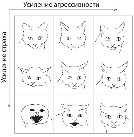Рис. 4.7. Мимика домашней кошки 50. Рассмотрим в качестве примера два разных вида сусликов (см. фото 20 на вклейке) – более примитивного (по своему строению) калифорнийского суслика (Spermophilus beecheyi) и более “прогрессивного” суслика Белдинга (Spermophilus beldingi). У обоих видов есть сигналы опасности – щебет и свист. У суслика Белдинга свист – сигнал очень сильной опасности, а щебет (или, точнее, его аналог – трель) – умеренной. Заметим еще раз, что под словом “сигнал” здесь не имеется в виду никакого намеренного действия, специально предназначенного для коммуникации. Просто у суслика, который сильнее испуган, звук получается более похожим на свист – тем более, чем сильнее страх. Соответственно, между трелью и свистом возможно бесконечное число промежуточных “сигналов”. Сородичи, слышащие этот звук, “заражаются” соответствующей эмоцией (подобно тому, как людей “заражает” зевота или смех), и у многих из них непроизвольно возникает соответствующая вокализация. К этому уровню развития коммуникации вполне применимо рассуждение Е.Н. Панова 51, согласно которому никаких “языков” у животных нет. Но у калифорнийского суслика коммуникативная система устроена принципиально иначе. Свист и щебет становятся референциальными сигналами (англ. referential signals), т. е. сигналами, обозначающими вполне конкретный объект внешнего мира (называемый в семиотике “референтом”): свист означает “опасность с воздуха”, щебет – “опасность с земли” 52. “Этимология” этих сигналов не менее прозрачна, чем “этимология” демонстраций такырной круглоголовки: летящий хищник обычно более опасен (и, соответственно, страшен), чем хищник наземный. Но функционирование свиста и щебета у калифорнийского суслика отличается кардинально. Промежуточных градаций между ними нет – как нет промежуточных градаций между орлом, летящим по воздуху, и койотом, бегущим по земле. Эти сигналы уже не настолько связаны с эмоциями: суслик может быть очень испуган внезапным появлением наземного хищника, но все равно звук, который он издаст, будет (с максимальной вероятностью) щебетом, а не свистом. И наоборот, хищная птица может быть очень далеко в небе и не вызывать большого страха – но суслик, видя ее, будет (в подавляющем большинстве случаев) издавать свист. Сигналы этого типа (хотя они, возможно, также не являются преднамеренными) не “заражают” сородичей эмоциями, а предоставляют им конкретную информацию об окружающем мире. Соответственно, референциальные сигналы с полным правом можно назвать сигналами‑символами (как это сделано в работе этолога Владимира Семеновича Фридмана 53), поскольку у них нет обязательной природной связи между формой и смыслом. Интересно, что у этих видов сусликов различается и восприятие сигнала: суслики Белдинга ретранслируют сигнал только в том случае, если сами в достаточной степени напуганы, калифорнийские же суслики способны передавать информацию дальше независимо от своего эмоционального состояния. Интенсивность воздействия сигнала в этой системе пропорциональна не степени возбуждения издающей сигнал особи, а степени стереотипности его внешней формы (поскольку наиболее “правильного” вида сигналы наиболее эффективно распознаются детекторами). Этот пример показывает, что специализация к определенному типу существования у общественных животных може
