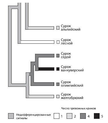 Рис. 4.8. Это родословное древо сурков (род Marmotta) построено на основании молекулярных данных, но по нему видно, что при переходе от более примитивных видов к более прогрессивным число различных сигналов увеличивается 61. Коммуникативную систему верветок нередко рассматривают как промежуточный этап на пути к человеческому языку: сначала сигналов было, как у верветок, лишь несколько, потом, постепенно добавляя по одному сигналу, предки человека добрались в конце концов до языка современного типа 62. Однако это, по‑видимому, неверно. Дело в том, что, во‑первых, внешняя форма (звуковая оболочка) сигналов у верветок является врожденной, следовательно, расширение такой коммуникативной системы и добавление в нее новых сигналов может происходить только путем генетических мутаций. Человеческая же система знаков не врожденная, она содержит огромное число элементов (десятки тысяч – для такого количества нужных мутаций просто не хватило бы эволюционного времени) и, кроме того, является принципиально открытой, добавление в нее новых знаков легко происходит за время жизни одного индивида. Возможно, что вы, читая эту главу, пополнили свой лексикон несколькими новыми словами – верветке такого не достичь. Все, что она может сделать за время жизни, – это несколько уточнить форму (акустические характеристики) и значение того или иного крика (например, усвоить, что сигнал “орел” не относится к птицам‑падальщикам) {31}. Во‑вторых, в человеческом языке принципиально иначе устроена реакция на сигнал. Если у верветок восприятие сигнала жестко задает поведение, то у человека восприятие сигнала задает лишь начало деятельности по его интерпретации (по мнению Т. Дикона, это вызвано наличием огромного количества ассоциативных связей между словами‑символами в мозге 64), результаты же этой интерпретации могут зависеть от личного опыта, от индивидуальных особенностей характера, от отношения к подавшему сигнал, от сиюминутных намерений и предпочтений и т. д. и т. п. Поэтому нередко оказывается, что реакция на один и тот же текст у разных слушателей (или читателей) резко различается. Подобная разница между людьми и верветками вполне объяснима. У верветок функция данного фрагмента коммуникативной системы состоит в том, чтобы обеспечить быстрый запуск правильной поведенческой программы спасения от соответствующего хищника, поэтому любые отклонения от стандартной реакции подавляются отбором. Человек же, в значительной степени вышедший из‑под контроля естественного отбора, может себе позволить долгие размышления о смысле услышанного сообщения. Таким образом, хотя верветки относятся, как и мы, к отряду приматов, между их коммуникативной системой и языком нет гомологии, а есть лишь аналогия. У других представителей церкопитековых, больших белоносых мартышек (Cercopithecus nicticans, см. фото 23 на вклейке), можно наблюдать еще одну аналогию с человеческим языком 65. У этих мартышек, как и у верветок, есть разные сигналы для разных типов опасностей – крик “пяу” (в англоязычных работах – pyow) означает “леопард”, крик “хак” (hack) – “орел”. Но у них, как установили Кейт Арнольд и Клаус Цубербюлер, есть также возможность комбинирования сигналов, и при этом получается, как в человеческом языке, нетривиальное приращение смысла (не сводящееся к простой сумме смыслов состав