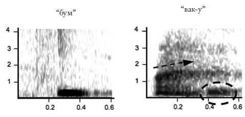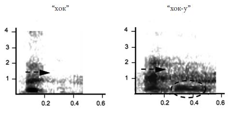 Рис. 4.9. Звуковые сигналы мартышек Кемпбелла (сонограммы). Черная стрелка показывает движение формант; пунктирной рамкой обведен “суффикс” “‑у” 67. В коммуникативной системе мартышек Кемпбелла представлены и правила “порядка слов”: например, сигнал “бум” употребляется только в начале цепочки криков и всегда повторяется дважды, сигнал “хок” предшествует сигналу “хок‑у”, если они встречаются вместе, серия криков, предупреждающая об орле, начинается обычно с нескольких криков “хок”, а заканчивается несколькими криками “крак‑у” и т. д. По мнению авторов исследования, в некоторых аспектах эта коммуникативная система приближается к человеческому языку даже больше, чем успехи человекообразных обезьян, обученных языкам‑посредникам и умеющих составлять комбинации типа “ВОДА”+“ПТИЦА”, хотя настоящей грамматикой она все же не обладает 68. И дело здесь не только в том, что правила достаточно просты, а их число невелико. Главное, на мой взгляд, отличие этой системы от человеческого языка – отсутствие в ней достраиваемости: есть шесть криков и девять возможных “предложений”, и этим все ограничивается, новые знаки и новые сообщения не строятся. Ограниченность исследованного материала не дает возможности судить о том, являются ли все эти сигналы (в том числе содержащие суффикс “‑у”) и их комбинации врожденными, присущими всем представителям Cercopithecus campbelli campbelli, или же, по крайней мере, некоторая часть этой системы является культурной традицией данной конкретной популяции. По наблюдениям авторов, верно скорее первое: сигналы издаются без волевого контроля, самцы не демонстрируют намерения информировать сородичей, они просто испытывают эмоции – и на этом фоне у них издаются соответствующие крики. В то же время эти данные показывают, что даже при отсутствии волевого контроля за звукопроизводством жизнь вида, ведущего групповой образ жизни, в лесу, в условиях низкой видимости и большого количества хищников располагает к формированию коммуникативной системы, которая использует комбинации звуковых сигналов (как друг с другом, так и с элементами, не являющимися отдельными сигналами), чтобы из небольшого количества доступных врожденных криков произвести больше различных сообщений. Если рассмотреть коммуникативные системы различных видов позвоночных, можно увидеть еще одну общую тенденцию – уменьшение степени врожденности. У низших животных, обладающих коммуникативной системой, врожденной является как внешняя форма сигнала, так и его “смысл” (то, что так или иначе будет определять поведение животного, воспринявшего данный сигнал); реакция на сигнал так же врожденна и стереотипна, как и реакция на несигнальные раздражители (поэтому такие сигналы называются релизерными). Например, птенец серебристой чайки, выпрашивая пищу, клюет красное пятно на клюве родителя, и это побуждает родителя покормить птенца, – в этом примере врожденными, инстинктивными, являются как действия птенца, так и реакция взрослой птицы. Сигналы такого рода, разумеется, могут до некоторой степени совершенствоваться в ходе развития отдельной особи (так, птенец чайки с течением времени “натренировывается” более метко попадать в красное пятно), но не более, чем любые другие инстинктивные действия. У животных, обладающих более высоким уровнем когн