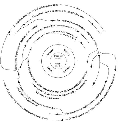 Рис. 5.4. Модель оптимизации и приспособления к условиям для пищевого поиска гоминид на протяжении сезонного цикла (с учетом сезонных изменений доступности пищевых ресурсов), предложенная Р. Фоули 103 . Вообще, открытые ландшафты, по‑видимому, дают больше, чем лесные, разнообразных условий среды, к которым можно приспосабливаться. Если, например, рассмотреть эволюцию в семействе полевок 107, то можно увидеть, что род рыжих полевок, живущих в лесу, содержит сравнительно немного видов, и все они довольно архаичны, то есть сформировались достаточно давно и с тех пор не менялись. Напротив, серые полевки, освоившие луговые местообитания, демонстрируют целый спектр сравнительно молодых видов – это значит, что им приходилось то и дело приспосабливаться к меняющимся условиям среды. О том, что экологическая ниша, которую начали осваивать гоминиды, была для них новой, свидетельствует, в частности, полиморфизм ранних представителей клады человека (независимо от того, являются ли найденные останки действительно принадлежащими столь многим разным видам или даже родам или в ряде случаев демонстрируют лишь разнообразие локальных вариаций в рамках одного рода или вида). Возникновение любого нового таксона “до некоторой степени аналогично проникновению на мало заселенные острова” 108 (т. е. в новую экологическую нишу), и на начальных этапах его существования имеет место “бурная дивергентная эволюция” 109, причем ранние члены таксона даже на низких таксономических уровнях резко различаются между собой, “порой по признакам, которые позже будут характеризовать таксоны гораздо более высокого ранга” 110 (так называемый “закон архаического многообразия”). Движение от разнообразия к единообразию в процессе происхождения человека иллюстрируют в том числе и следующие факты. У Homo habilis наблюдается значительная вариативность по объему мозга (от 500 до 800 см3) – и на следующую ступень эволюции “переходят” лишь обладатели самого большого мозга (в итоге у архантропов он достигает более 900 см3). Точно так же у Homo heidelbergensis сильно варьировали возможности слухового анализатора (см. рис. 3.6 в гл. 3) – и для перехода на следующую ступень эволюции были отобраны обладатели лишь одного из возможных вариантов. Видимо, отбор шел на приспособленность к определенным поведенческим свойствам, а сами свойства появлялись в ответ на некий эволюционный вызов. Примерно так же происходило образование нового вида тлей в опытах Георгия Христофоровича Шапошникова 111: при насильственной пересадке в другую экологическую нишу (на другое растение) наблюдалось сначала повышение вариативности, а потом (за 170 поколений) из этого множества вариантов отобрались наиболее приспособленные, и появился новый вид (не только отличающийся по своему строению, но и не скрещивающийся с видом‑предком). О том, какую именно нишу стали осваивать далекие предки человека, существуют разные мнения. Одни исследователи полагают, что гоминиды занимались поеданием падали – в это время сильно уменьшилось число видов крупных гиен 112, так что невостребованных трупов должно было быть в достатке. Кроме того, гоминиды за счет того, что отсутствие волос, обилие потовых желез и выпрямленная походка предохраняли их от перегрева, могли быть активны в жаркие дневные часы, избегая тем самым конкуренции с другими люб