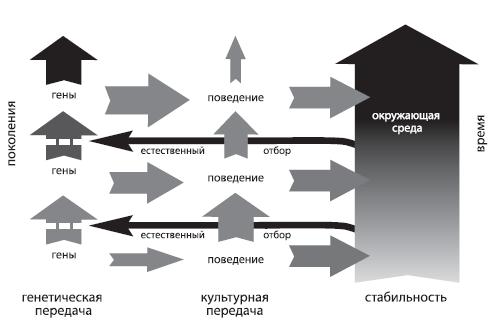 Рис. 5.7. Эффект Болдуина Когда преимущества, которые дает то или иное поведение, достаточно серьезны, отбор благоприятствует тем популяциям, где особи, способные к нему, появляются чаще. Именно так, скорее всего, происходило и формирование языка – через постепенное накопление (сначала – в рамках видовой нормы реакции) тех, кто лучше умел доносить свои мысли до окружающих, и тех, кто был наиболее успешен в понимании. Если бы языковая способность возникла в результате мутации у единичной особи, язык не смог бы сформироваться – так же, как не складывался язык в никарагуанской школе для глухих, пока число стремящихся общаться между собой воспитанников не перевалило за две сотни 131. Если то или иное поведение окажется полезным, будут закрепляться мутации, способствующие совместному наследованию всего того комплекса признаков, который обеспечивает данное поведение. Будут поддерживаться отбором и те мутации, которые будут изменять анатомию организма в сторону, благоприятствующую данному поведению. Например, успехи в ухаживательном поведении, включающем демонстрацию развернутого веером хвоста, формируют в конечном итоге хвост, весьма выигрышно выглядящий в развернутом виде. Вероятно, такого же рода эволюцию можно предполагать и для языка: если, например, стремление произносить звуковые сигналы максимально внятно и разборчиво приносило ощутимые выгоды в деле выживания и размножения, то отбором закреплялись такие анатомические свойства, которые максимально облегчали особям эту задачу (пусть даже в ущерб каким‑то другим жизненным интересам), – и в итоге люди получили свою опущенную гортань. Если выгодно было уметь передавать максимум информации за один раз, закрепились мутации, позволявшие (пусть с большей тратой ресурсов) более эффективно управлять дыханием, и т. д. Этот механизм эволюции отличается от широко распространенных представлений, согласно которым сначала возникает мутация, а потом организмы пытаются извлечь из нее какую‑то пользу. В данном случае, наоборот, сначала формируются те или иные поведенческие навыки, и лишь потом те особенности организма, которые позволяют реализовывать их наилучшим образом, закрепляются генетически (что обеспечивает эффективное наследование поведения без прямого закрепления в генах конкретных поведенческих моделей). Согласно этому сценарию, мутации – необходимый компонент эволюционного процесса, но для каждого отдельного эволюционного события генетическое закрепление тех или иных характеристик фенотипа – не начальная, а, скорее, завершающая стадия. Какие именно фенотипические характеристики могут возникать в ходе эволюции подобным образом – вопрос сложный, и окончательного ответа на него в науке пока нет, но то, что в эволюции поведения эффект Болдуина играет значительную роль, по‑видимому, факт. А следовательно, для происхождения языка такой эволюционный механизм представляется более вероятным, нежели обратный (сначала – мутации, потом поведение). Способности к поведенческому приспособлению имеются у многих животных, но человекообразные обезьяны продвинулись в этом значительно дальше других. Они способны не только осознать один элемент ситуации как средство обработки другого (например, ручей как средство для мытья клубней или камень как средство для того, чтобы р