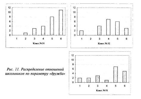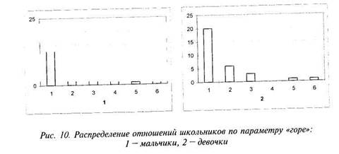 Таким образом, оценочно-эмоциональные отношения мальчиков и девочек к художественно-эстетическим видам деятельности растут вместе с дифференциацией эстетических чувств и эстетического сознания, особенно у мальчиков. Система личностных отношений и ценностей у школьников 9—12 лет В данном исследовании использовался опыт анализа полученных при помощи проективного теста «Домики» психологических данных с применением Statisticafor Windows Release 4.5 A Copyright& StatSoft inc 1993. Были проанализированы статистические распределения данных, полученных при помощи проективного теста личностных отношений и ценностных ориентации «Домики» в трех классах общеобразовательной школы: в двух 3-х классах и одном 5-м классе, всего 70 человек. В целях соблюдения этических норм движения психологической информации мы обозначили классы 31, 32 и 51. Цветовая диагностика эмоций ребенка Глава 4. Диагностика социальных эмоций в контексте решения... 91 Таким образом, мы могли отследить изменения в формирования личностных отношений и ценностных ориентации в зависимости от возраста детей и стиля педагогических отношений. Дети 31-го и 32-го классов (возраст 9-10 лет) были отобраны в 7-летнем возрасте на основании предварительного тестирования на уровень школьной зрелости. Класс 31 отличался тем, что в нем были собраны дети более успешные, лучше подготовленные к школе. По нашим наблюдениям, они с первого класса отличались более высокими темпами учебной деятельности и работоспособностью и, как следствие, испытывали меньшее давление со стороны учителей и классных руководителей. Критерием оценки являлся характер гауссовского распределения, при котором соответствие или несоответствие анализируемого распределения отношений нормальному статистическому распределению указывает на механизмы протекания психических процессов (см. подробно в разделе «Применение компьютерных технологий»). В данном случае отношения школьников могут выступать на уровне эмоций или ценностей. На приведенных ниже графиках диаграммы 1, 2 соответствуют последним местам рейтингового или негативного предпочтения детьми социальных объектов, оценивающиеся соответственно 1 и 2 баллами. Диаграммы с 3 по 6 - позитивные предпочтения, соответствующие 4, 3, 2 и 1-му местам, оценивающиеся соответственно 3, 4, 5 и 6 баллами. Анализировались также количественные характеристики инверсий системы личностных отношений. Детей, не имеющих инверсий со стороны личностных отношений, в более успешном 31-м классе оказалось больше, чем детей с проблемами личностного развития. В то время как данные инверсий со стороны системы личностных отношений 32-го класса выглядят аналогично данным по 51-му классу (дети 11-12 лет): в этих классах детей, не имеющих инверсий в системе личностных отношений, оказалось значительно меньше. Основной вывод - успешность в учебной деятельности, стиль педагогического общения, так же как и особенности подросткового возраста, в значительной мере определяют развитие системы личностных отношений и ценностей школьников. При этом различий по полу не наблюдалось. Характер распределения по параметру «счастье» в системе личностных отношений указывает на тот факт, что в возрасте 10-12 лет у детей происходит переоценка ценностей. Многие считают, что «счастье» - ценность, но у большинства детей отношение к понятию «счастье» вы