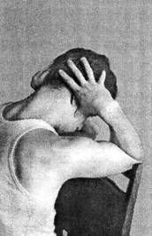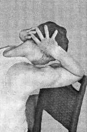 Лечебное движение при болях, усиливающихся при разгибании в средне– и нижнешейном отделах позвоночника, осуществляют в положении сидя на стуле (как на коне) лицом к спинке стула. Опираться локтями на спинку стула с максимальным приведением подбородка к грудине так, чтобы внутренние края указательных пальцев, расположенных на затылке, и большие пальцы, расположенные на скуловых дугах, фиксировали затылок в положении максимально возможного сгибания. На фазе «вдох» в течение 9‑11 секунд против сопротивления своих пальцев разгибать затылок, взгляд вверх. На фазе «выдох» в течение 6‑8 секунд расслабление мышц, взгляд вниз, – за это короткое время свободным естественным движением нужно попытаться по возможности увеличить амплитуду сгибания в средне– и нижнешейном отделах позвоночника (при этом мышцы не напрягать). Лечебное движение повторить 3‑6 раз, каждый раз на фазе «выдох» чуть увеличивая амплитуду сгибания в средне– и нижнешейном отделах позвоночника (рис. 59, 60).