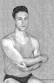 Лечебное движение для расслабления надостной мышцы при болях в плече при отведении руки в сторону проводить в положении сидя на кушетке. Кистью здоровой руки обхватить больную руку снизу за локоть и привести ее (приблизить) к средней линии живота насколько это возможно. На фазе «вдох» в течение 9‑11 секунд провести давление локтем на здоровую кисть в направлении отведения (отдаления от тела) руки наружу. На фазе «выдох» в течение на 6‑8 секунд расслабление мышц, – за это короткое время свободным естественным движением нужно попытаться по возможности с помощью здоровой руки увеличить амплитуду приведения больной руки к телу (при этом мышцы не напрягать). Лечебное движение повторить 3‑6 раз, каждый раз на фазе «выдох» с помощью здоровой руки чуть увеличивая амплитуду приведения больной руки к телу (рис. 69, 70).