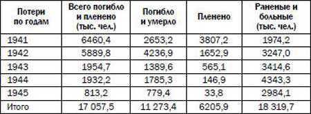 Таблица 18. Потери Красной Армии в 1942 году Здесь следует отметить, что в показатель «пораженные в боях» входят раненые, контуженые, обожженные и обмороженные. А в показатель «раненые», чаще всего используемый в статистике, обычно включаются только раненые и контуженые. Доля раненых и контуженых среди пораженных в боях для Красной Армии в годы Великой Отечественной войны составляет 96,9 % [382]. Поэтому без большой погрешности можно относить показатели для раненых ко всем пораженным в боях и наоборот. Еще до публикации этих данных Д.А. Волкогонов пытался оценить советские потери в Великой Отечественной войне, причем тогда он уже, скорее всего, располагал приведенными выше данными о безвозвратных потерях Красной Армии в 1942 году. По мнению Волкогонова, «число погибших военнослужащих, партизан, подпольщиков, мирных граждан в годы Великой Отечественной войны колеблется, видимо, в пределах 26–27 миллионов человек, из них более 10 миллионов пали на поле боя и погибли в плену. Особенно трагична судьба тех, кто входил в состав первого стратегического эшелона (и основной массы стратегических резервов), кто вынес главные тяготы войны в 1941 году. Основная, прежде всего кадровая, часть личного состава соединений и объединений этого эшелона сложила головы, а около трех миллионов военнослужащих оказались в плену. Немногим меньше были наши потери и в 1942 году» [383]. Вероятно, Волкогонов имел пред собой также данные о числе советских пленных по годам, опубликованные американским историком Александром Даллином (о них – чуть ниже). Там число пленных в 1941 году определяется в 3355 тыс. человек. Вероятно, Волкогонов округлил эту цифру до 3 млн. В 1942 году число пленных, по А. Даллину, составило 1653 тыс. человек. Вероятно, Волкогонов вычел эту величину из своих данных о безвозвратных потерях 1942 года, получив число убитых и умерших в 4235 тыс. Не исключено, что он счел, что в 1941 году среднемесячный уровень потерь убитыми был примерно таким же, как и в 1942 году, и тогда потери 1941 года убитыми оценил примерно в половину от потерь 1942 года, т. е. в 2,1 млн человек. Не исключено, что Волкогонов решил, что, начиная 1943 года, Красная Армия стала воевать лучше, среднемесячные потери убитыми сократились вдвое по сравнению с уровнем 1942 года. Тогда в 1943 и в 1944 годах ежегодные потери он мог оценить в 2,1 млн человек убитыми и умершими, а в 1945 году – примерно в 700 тыс. человек. Общие потери Красной Армии убитыми и умершими, без умерших в плену, Волкогонов мог оценить в 11,2 млн человек, а число умерших пленных А. Даллин оценивал в 3,3 млн человек. Общие потери Красной Армии убитыми и умершими Волкогонов мог оценить в 14,5 млн человек, что было больше 10 млн, но меньше 15 млн. В точности этой цифры исследователь, вероятно, не был уверен, поэтому и написал осторожно: «более 10 миллионов» (но не более 15 млн, а когда пишут «более 10 млн», подразумевается, что эта величина все‑таки меньше 15 млн). Интересно, что данные Волкогонова использовала еще одна группа исследователей. В.И. Феськов, К.А. Калашников и В.И. Голиков следующим образом определяют потери Красной Армии в Великой Отечественной войне [384]: