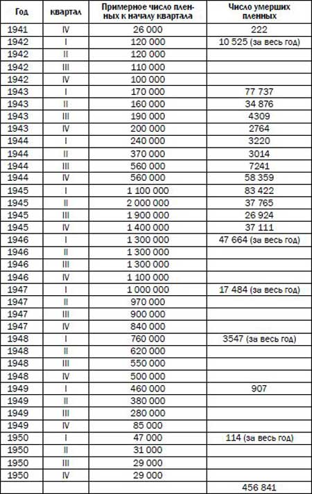 Таблица 20. Динамика немецких пленных в СССР, 1941–1950 гг. Строго говоря, германские пленные умирали и в 1951–1955 годах, но вряд ли суммарная смертность за эти годы превышала несколько десятков человек, равно как такую величину вряд ли превышала смертность пленных в III квартале 1941 года. Из известных лиц, погибших после 1950 года, можно назвать бывшего командира дивизии СС «Мертвая голова» генерал‑майора войск СС Гельмута Беккера, расстрелянного в феврале 1953 года, и последнего коменданта Берлина генерала артиллерии Гельмута Вейдлинга, внезапно скончавшегося от сердечной недостаточности 17 ноября 1955 года, перед самой репатриацией. Не исключено, что ему помогли умереть как нежелательному свидетелю последних дней и самоубийства Гитлера. Из анализа данной таблицы следует, что смертность пленных значительно возрастала в зимние месяцы и действительно стала значительно падать с 1946 года, когда началось массовое возвращение увечных, больных военнопленных на родину. В то же время нельзя безусловно доверять оценкам А. Хильгрубера о численности пленных на определенные даты. Так, согласно Хильгруберу, учитывая умерших к тому времени пленных, к концу 1944 года Красная Армия должна была захватить около 762 267 германских пленных, из которых умерло 202 267 человек. Между тем, к 30 ноября 1944 года потери германских сухопутных войск на Восточном фронте пропавшими без вести составили 997 056 человек [507]. 10 или 15 тыс. пленных из числа люфтваффе картину принципиально не меняют, а в декабре 1944 года значительных потерь пленными вермахт на Востоке не имел. Тогда получается, из числа пропавших без вести к погибшим на поле боя можно отнести не более 245–260 тыс. человек. Между тем, к 1 января 1945 года в советском плену оказалось всего 941 552 пленных из числа немцев и их союзников [508]. Из этого числа 48 957 человек приходится на итальянцев, кроме того было захвачено 452 испанца, 2377 финнов, 187 367 румынских военнопленных и 14 129 молдаван, служивших в румынской армии [509], 70 тыс. венгерских пленных, попавших в плен в 1942–1943 годах, и не менее 10 тыс. евреев и 383 цыган, служивших в венгерской армии, а также 65 тыс. венгров, сдавшихся в плен или перешедших на сторону Красной Армии в 1944 году [510]. В этом случае на немецких военнопленных придется около 543 тыс. человек, из которых умерло к тому времени 202,3 тыс. человек, или 37,3 %, а не 26,5 %, если принять оценку А. Хильгера. Следует отметить, что число неприятельских пленных, показанное в первичных донесениях советских соединений и объединений, часто было завышенным, как это обычно случается в подавляющем большинстве армий мира. Так, выступая на научной конференции по изучению Берлинской операции войск 1‑го Белорусского фронта, член Военного совета фронта генерал‑лейтенант К.Ф. Телегин заявил: «В период январских боев 1945 года штабы армий и отдельных корпусов 1‑го Белорусского фронта донесли об уничтожении 1749 и о захвате 599 танков и самоходных орудий противника, что соответствовало количеству танков и самоходных орудий 2348, потребному для укомплектования четырнадцати немецких танковых дивизий. В действительности всего в январе 1945 года перед фронтом действовали две танковые дивизии, три бригады штурмовых орудий, две мотодивизии и отдельные танковые части и подразделения общей численностью не выше 920 единиц. А мы уже уничтожили и захватили 2348… После Варшавско‑Л