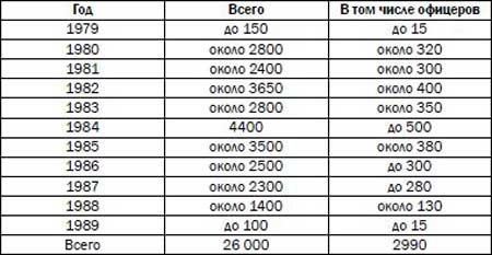 Таблица 28. Потери Советских войск в Афганистане, 1979–1989 гг., официальные данные [1031] По официальным данным, среди погибших было 190 военных советников, в том числе 145 офицеров, и 52 женщины, в том числе 4 прапорщика и 48 гражданских лиц. Из 53 753 раненых 2503 умерло и 7194 были уволены по состоянию здоровья, а из 415 932 заболевших умерло 817 человек и было уволено по состоянию здоровья 11 294 человека [1032]. Между тем, в таблице безвозвратных потерь число умерших от ран показано равным 2475. Вероятно, разница в 28 человек образовалась за счет тех, кто умер от ран, полученных в результате катастроф и других несчастных случаев. Число же умерших от болезней в таблице безвозвратных потерь, наоборот, оказалось на 16 больше. Поскольку там числом 820 определено число умерших от болезней в армии, а 13 приходится на КГБ, скорее всего, в число больных в санитарных потерях не включены больные, относящиеся к КГБ. Можно предположить, что боевые потери занижены за счет того, что жертвы катастроф, равно как и отдельные военнослужащие, ставшие жертвами нападений неизвестных, отнесены к небоевым потерям от несчастных случаев, тогда как многие жертвы катастроф в действительности погибли на минах, заложенных повстанцами, а жертвы нападений также во многих случаях приходились на партизанские акции. Существует и более высокая оценка советских потерь в Афганистане. Она дана в исследовании, осуществленном группой офицеров российского Генштаба под руководством В.А. Рунова. Им был доступен ряд армейских документов, связанных с Афганистаном. Общее число погибших и умерших они оценили в 26 000 человек. Очевидно, сюда включены только потери Советской Армии, без потерь КГБ и МВД. По годам эти потери распределяются следующим образом [1033]: