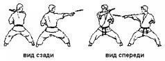получился угол в 90о, быстрым и резким движением руки посылает нож в цель. Это же движение ученик может сделать, вышагнув на указанную дистанцию в стойку хида‑ри‑зенкутцу‑дачи (передняя левосторонняя стойка), при броске ножа правой рукой. Можно также вышагнуть правой ногой в стойку миги‑зенкутцу‑дачи (передняя правосторонняя стойка) и также метнуть нож правой рукой (рис 15).