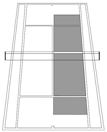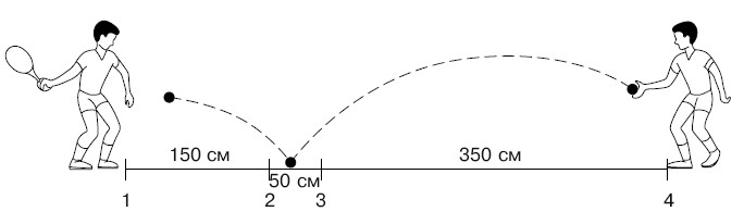 Освоив стойку, отработаем сам удар. В момент удара по мячу рука в запястье должна быть напряжена, ракетка расположена вертикально по отношению к земле или немного повернута плоскостью вверх. Лучше всего выполнять удар примерно с линии левой ступни с сопровождением мяча: рука с ракеткой некоторое время движется в направлении удара и останавливается на уровне головы перед левым плечом. Для отработки удара с партнером можно порекомендовать следующее упражнение. Пусть партнер медленно подбрасывает вам мяч рукой с расстояния примерно 1 м. Когда вы отработаете технику удара, можно будет увеличить расстояние. Для этого упражнения надо подготовить вот такую площадку (рис. 4.12). Вашему партнеру нужен десяток мячей. После выполнения упражнения вами можно поменяться ролями с партнером. Рис. 4.12. Площадка для выполнения упражнения