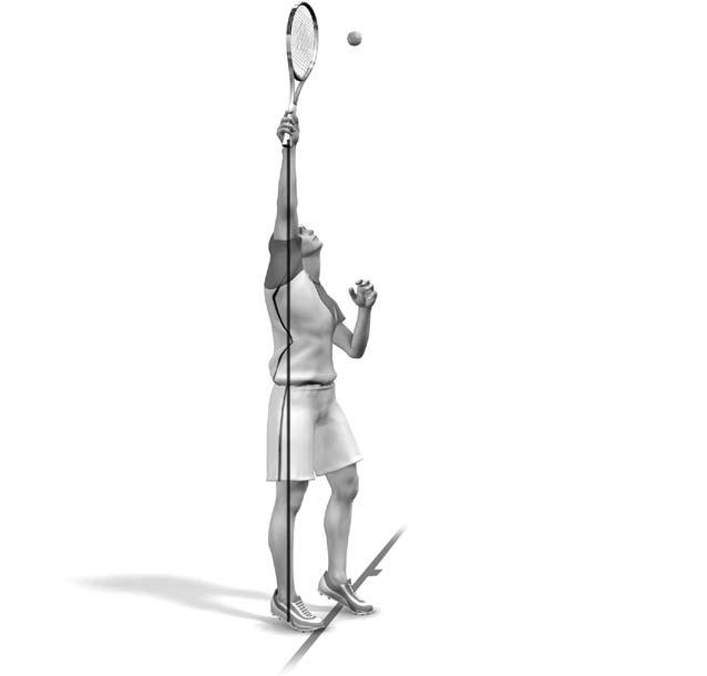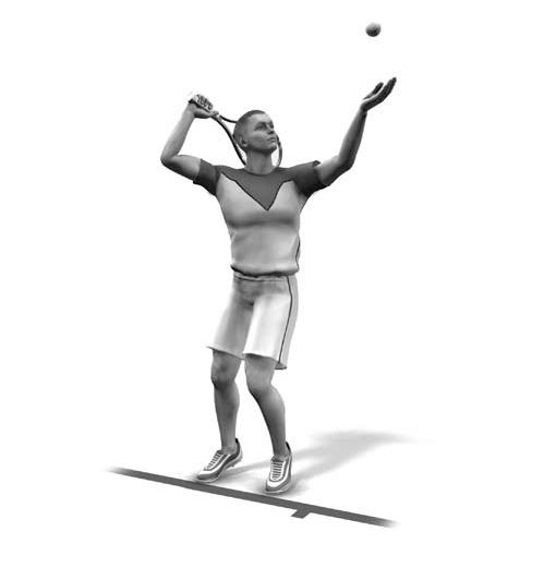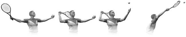 Вторая фаза движения имеет важнейшее значение для выполнения эффективной, сильной и уверенной подачи. Левой рукой вы продолжаете движение вверх и подбрасываете мяч. Правую руку с ракеткой сгибаете в локте и, описывая за головой петлю, опускаете за спину; при этом скорость ее движения становится максимальной (рис. 4.28). Рис. 4.28. Вторая фаза подачи