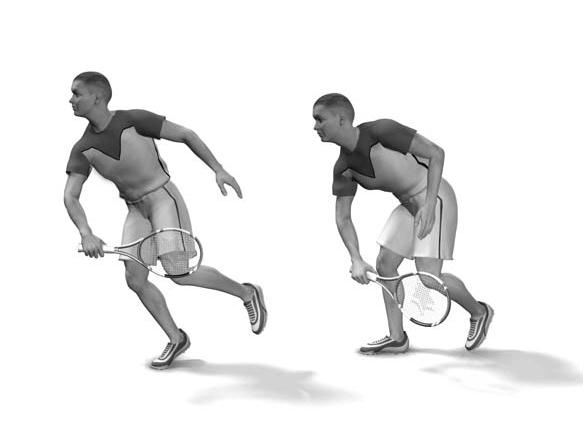 Очень важно: перед ударом по мячу и во время него левая нога остается на месте, не выдвигаясь вперед. После сопровождения удара ракетка останавливается слева от туловища у левой ноги. Вес тела после удара переносится на правую ногу, которая выставляется вперед за заднюю линию. Игрок будто бы следует за мячом, тем самым вкладывая силу, равную весу тела, в удар (рис. 4.29). Правильную подачу лучше изучать по видео, на котором в кинограмме движений спортсмена четко видны все фазы подачи. Учиться же подава ть самому лучше поэтапно, отрабатывая движения последовательно, через комплекс упражнений. Рис. 4.29. Правильное и неправильное положение