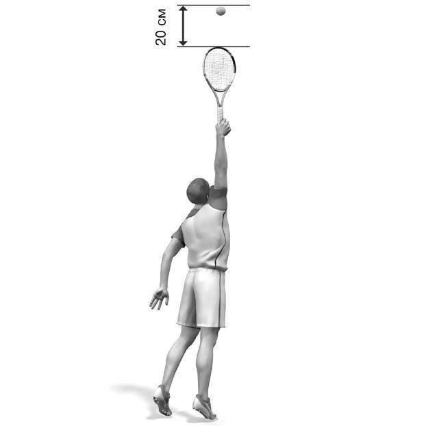 Правая ступня должна стоять параллельно задней линии, левая – образовывать с правой острый угол. Рука, в которой вы держите мяч, находится в исходном горизонтальном положении, повернута ладонью вверх, немного согнута и как бы показывает направление, куда вы хотите послать мяч. Учитесь подбрасывать мячик левой рукой, а если вы левша, то правой. В момент, когда рука выпускает мяч, она занимает вертикальное среднее положение между головой и левым плечом. Сначала выполните простое упражнение: подбрасывайте мяч до высоты 60–70 см. Перед тем как выпустить его, немного отклонитесь. Вы подбросили правильно, если поймаете выпущенный мяч в открытую ладонь, не сходя с места и не отклонившись в сторону. Правильно подброшенный мяч поднимается вертикально вверх. Если вы не будете его ловить, он должен упасть примерно в 15–20 см от носка левой ноги. Внимание Постановка ног меняется в зависимости от направления подачи, от того, с какой половины корта вы подаете. Положение ног вам определит тренер, исходя из вашей привычки, скорректированной для наиболее эффективной стойки.