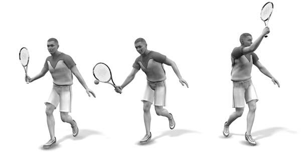 Удары с хода достаточно просто выполнимы как справа, так и слева. При ударе справа с хода подготовку нужно начинать даже раньше, чем к удару справа на месте, так как вам нужно больше времени, чтобы сделать удар точным. Замах немного меньше, чем для удара на месте, потому что игра идет гораздо ближе к сетке, а локоть больше прижат к туловищу (рис. 5.12). Рис. 5.12. Удар справа с хода